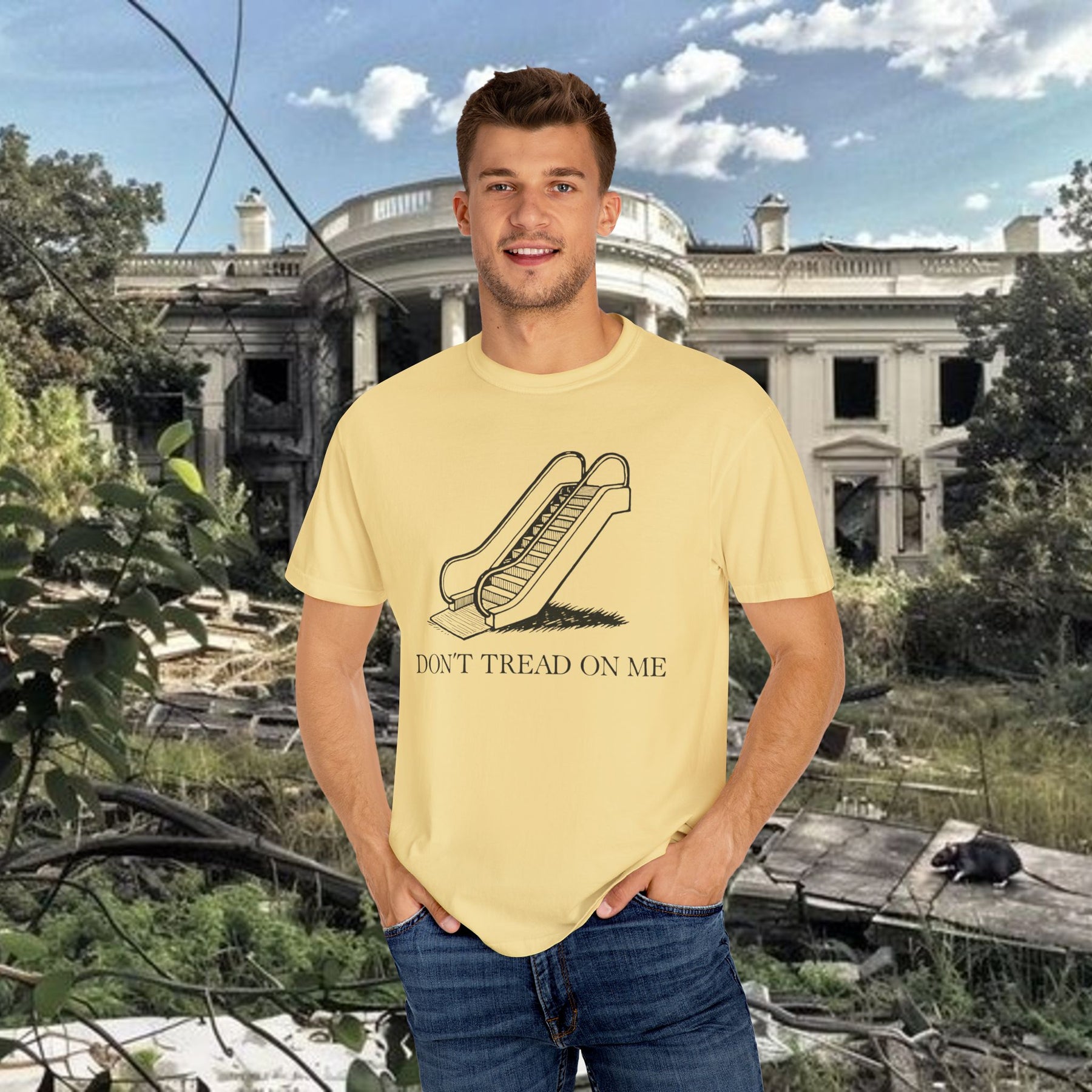 Trump Escalator Joke T-shirt, Political Graphic Tee, Gadsden Flag Mockery Shirt