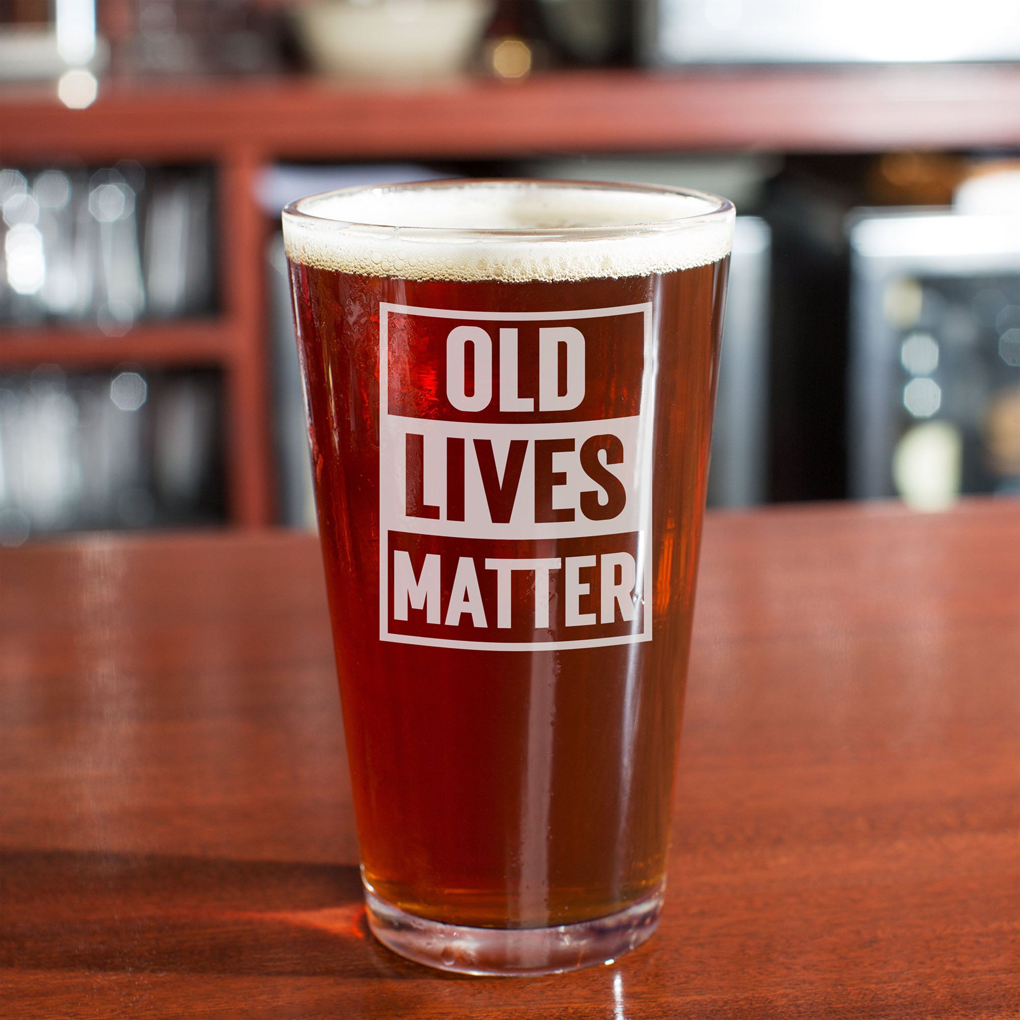 Articles de bar gravés « Old Lives Matter », comprenant des pintes de bière, des tasses et des verres à whisky.